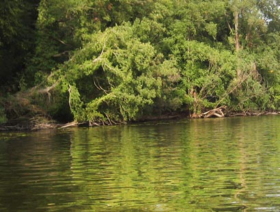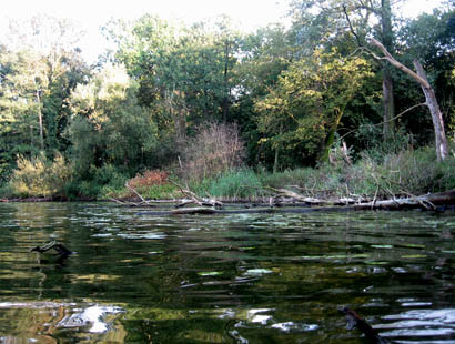 Zunächst eine Karte zur Orientierung für die Angelstellen und Angelplätze an dieser HavelinselDie Boote haben wir gegenüber dem Osttufer zu Wasser gelassen. Ohne Motorisierung sind es nur ein paar Ruderschläge zum vielversprechenden Ostufer. Hier machte sich schnell der Eindruck breit, ein Hotspot gefunden zu haben. Das gesamte Ufer ist mit Sträuchern, umgefallenden Bäumen, Seerosenfeldern und allem anderen, was der Räuber als Unterstand nutzt, übersät. Das Ufer fällt ziemlich steil ab. Gerade in den Sommermonaten sind die meist fängigen Schattenplätze keine Mangelware.