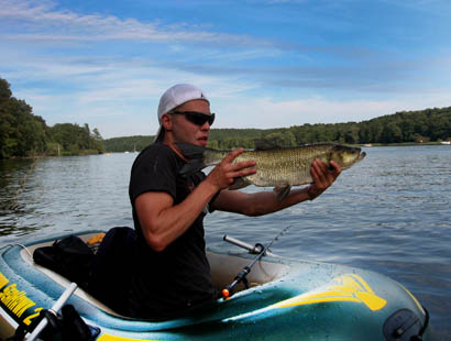 Die Pfaueninsel ist für Angler ein paradiesisch wirkender Angelspot. Zu befischen ist die Insel nur vom Boot aus. Die Fähre bringt euch zwar sicher für ein kleines Entgelt an das andere Ufer, jedoch ist das Angeln dort strengstens untersagt. Unser Tripp führt uns an einem heißen Spätsommertag mit dem Schlauchboot einmal um die Insel. In diesem Bericht stellen wir euch nur Uferspots vor. Wer mit dem Echolot um die Insel fährt, findet dort schließlich vielversprechende Unterwasserkanten und Löcher. Doch die Strategie an diesem Nachmittag sollte es sein, Fisch im Holz und Seerosen finden. Es war brütend heiß, an die 30 Grad, also ziemlich schwierige Bedingungen zum Raubfischangeln.