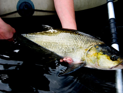 Also weiter Richtung Nordspitze der Insel. Wir konnten es kaum glauben, Hotspot folgte dort Hotspot. Jede Ecke hatte irgendetwas, was auf Raubfisch hindeutete.Paradiesische Spots Sommerspots. Ganz wichtig also: immer die Schattenplätze suchen! Und so war dann auch schnell der erste Rapfen brutal eingestiegen. Die Stickbaits, typisch Walk the Dog am Holz präsentiert, ergaben am leichten Barschtackle einen starken Drill.