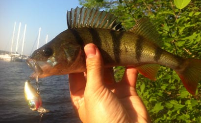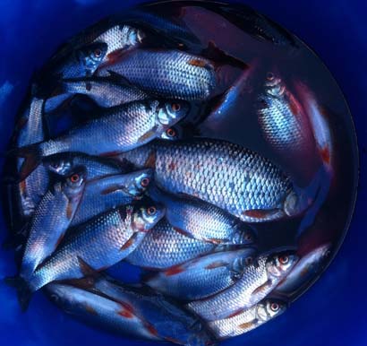 Ok, genug des guten, die erste Puste war raus und es wurde sich zurückgelehnt auf dem Wasser. Kein Bier vor um acht, heißt es für manche. Doch nun war die Zeit reif. Der Männertag konnte beginnen mit sechs Köderfischruten im Wasser. Und auch hier tat sich nichts. Nur der Kasten leerte sich. Es war wie verhext. Auf unterschiedlichsten Tiefen null Reaktion. Kann doch nicht sein, dass die Kunstköder den einzigen Tageserfolg bringen sollten?! An den Montagen warteten kleine Barsche und Plötzen auf ihre gefräßigen Räuber. Einen halben Zentimeter unter ihren Rückenflossen hielt sie der Drilling fest, an der Stelle also, die am Stärksten ist und beim Auswerfen weniger zum Ausschlitzen führt. Doch die Köder blieben da unten recht einsam unter sich.