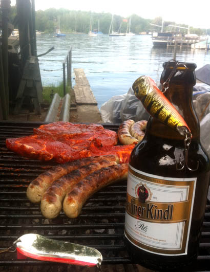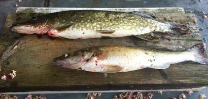 Dort wartete die für den Tag maßgebende Beute: Mit Bratwurstbauch ratze der eine trotz frischer Temperaturen auf einer Bank ein, der andere kümmerte sich weiter ums Pils, der nächste aber konnte schon wieder nicht stillhalten und zog seinen Spinner pausenlos unter die Steganlage hindurch. Erst ein Barsch und ein Döbel beruhigten ihn wieder. Der nächste gab sich mit einem Minihecht zu frieden. Petri sei dank, ein Toptag!