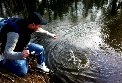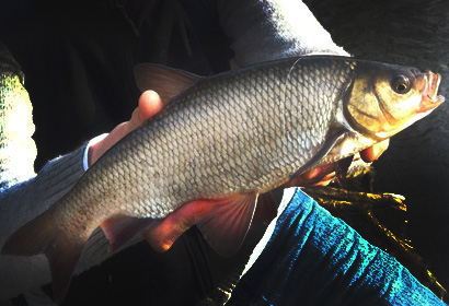 Schlecht gelaunt nahmen wir am Ufer der Nuthe platz und stärkten uns mit Brötchen. Fachsimpeln über Taktik war angesagt. Gesättigt und genervt, flogen ein paar Brotreste zu dem vor uns im Wasser balzenden Geflügel. Und dann geschah es! Wie aus dem Nix kam der erste Schwall. Völlig erstaunt flog das nächste Stück Brot und der nächste Schwall folgte. Die Döbel standen direkt an der Kante.Unsere Konversation über Taktikwechsel, gar der Nuthe den Rücken zu kehren, konnten wir in die Tonne kloppen. Das Anglerherz schlug wieder schneller. Ruckzuck 0.12 er Fluorcarbon an die Geflochtene geknüpft und einen dünndrähtigen Gamakatsu Einzelhaken montiert, fehlte nur noch eine Brotflocke zur perfekten Montage.