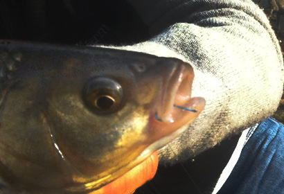 Durch Büsche und Geäst konnten wir nicht näher an den Spot. Also musste das Brot zu den Fischen treiben. Hier stellte sich ganz schnell heraus, dass es für diese Methode ein absolutes Muss ist, mit dehnungsarmer Geflochtener zu fischen. Den Anhieb mit der kurzen Rute auf großer Distanz zu setzen, setzt schließlich voraus, dass die Schnur sich nicht dehnt. So praktiziert, folgten weitere Fische.