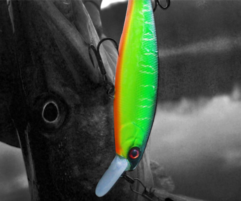 Die Tauchschaufel: Die oben aufgeführten Eigenschaften haben nichts mit der Lauftiefe eurer Baits zu tun. Mit Ausnahme vom Sinker, der durch seine Eigenschaft immer Richtung Grund taumelt. Auch ein Wobbler mit einer schwimmenden Aktion kann durch seine Tauchschaufel auf Tiefe gebracht werden. Die Form der Tauchschaufel bestimmt zunächst mal, wie tief der Wobbler geht. Steht sie eher senkrecht, läuft er flach und wackelt schneller hin und her. Steht sie eher fast waagrecht, taucht er tief und macht grössere, langsamere Ausschläge, ausserdem erzeugt er dann einen grösseren Wasserwiderstand. Auch eine grössere Tauchschaufel lässt ihn tiefer tauchen, ebenso wie eine Öse, die weiter hinten angebracht ist. Wichtig ist dabei, dass der Hardbait, auch wenn man ihn zügig durchs Wasser zieht, schön aufrecht schwimmt. Jedes Modell hat seine Maximalgeschwindigkeit, bei der die Aktion noch brauchbar ist. Zieht man ihn zu schnell, beginnt er zu kreiseln und taucht nicht mehr. Einige Wobbler vertragen konstruktionsbedingt nicht so hohe Tempi, andere sind einfach nur schlecht. Die Tauchschaufel bestimmt zusammen mit der Form des Körpers, wie sich der Wobbler bewegt: ob er sich um die Längsachse von Seite zu Seite wiegt (eher bei flachlaufenden Modellen und seitlich abgeflachten Körpern der Fall), oder um eine senkrechte Achse hin und her dreht („mit dem Schwanz wackelt“, wie der Rapala Taildancer und andere Tieftaucher).