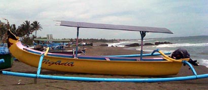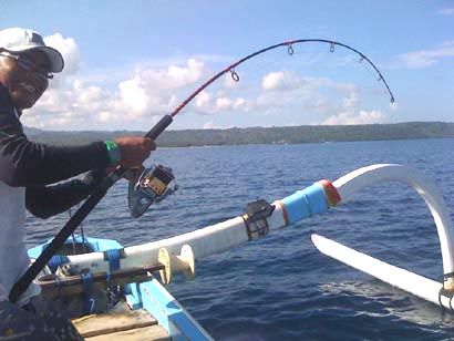 … ein Stock mit Seil! Aber der Reihe nach: Ketut sitzt vor mir. Der kleine surrende Yamaha schiebt unseren geräumigen Einbaum mit den riesigen Auslegern von Lovina Beach aufs offene Meer hinaus. Noch scheint die Sonne nicht über diesem spiegelglatten Indischen Ozean, Bali Sea. Und doch ist es so verdammt heiß in der morgendlichen Dunkelheit, wie es in Europa nur an einem Hochsommermittag wird. Auf dem Boden liegen zwei schwere Penn-Hochseeangelruten, 60 bis 80 Pfund, bestückt mit 20er Wobblern, wie man sie nicht von der Größe, aber von der Optik her auch von zuhause kennt. Ein Vermögen hat das Ganze Ketut gekostet. In Bali können sich Einheimische so etwas zum Angeln eigentlich nicht leisten, erzählt er. Es sei denn, sie arbeiten gut, etwa für Touristen. Und als Paradies zum Surfen und Tauchen ist das auf Bali mitunter möglich. Wer indes zu denen gehört, die Urlaub auf Bali machen, können sich Ausrüstung in Denpasar zum Spottpreis besorgen und Tackle mit dem Flieger nach Hause mitnehmen. Wo sonst gibt es schon eine Shimano Outlet Store Abteilung? Erste Adressen, die eigentlich ausreichen, sind etwa die Läden „Istana Pancing“ an der Jl Diponegoro, Nr. 201/Pasar Sangiah Lantai Nr. 3 oder: „Puri Pancing“ in der Jl. Diponegero Nr. 127. oder: Jl Imam Bonjol Nr. 1, an der Kreuzung zur Jl Hasanudin. Wer allerdings nach Charter/Angeltouren fragt, bekommt wenig hilfreiche Tipps. Besser ist es in jedem Fall, einen Einheimischen für sich zu gewinnen.