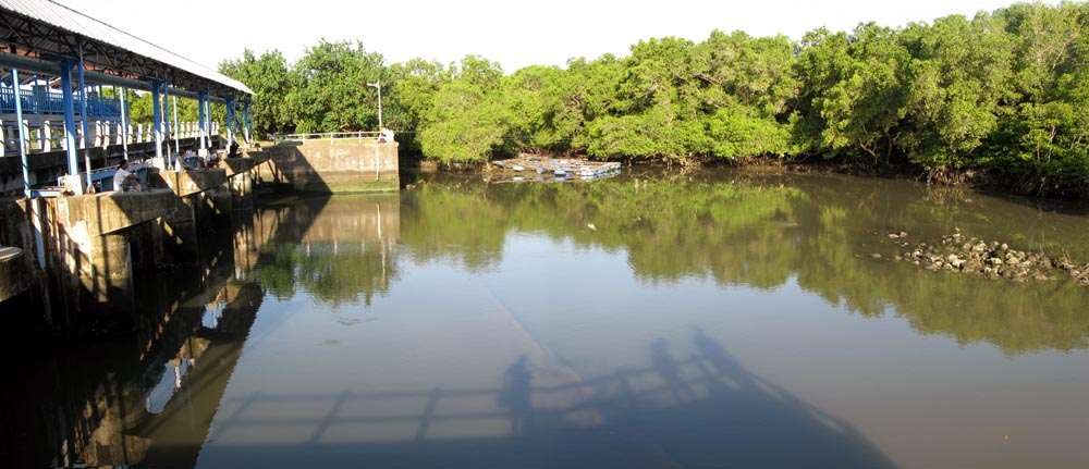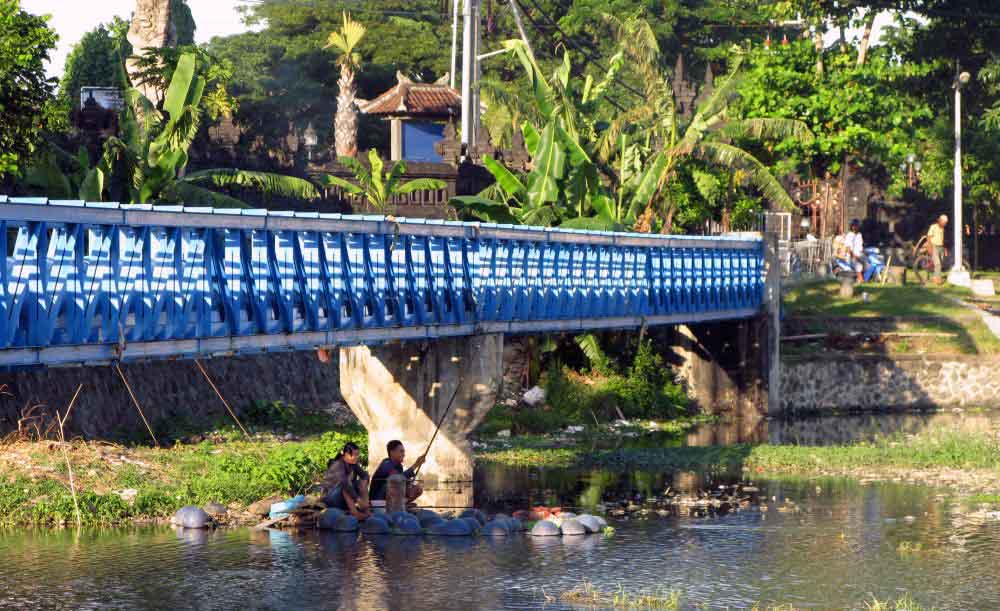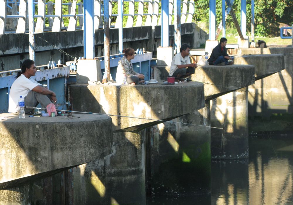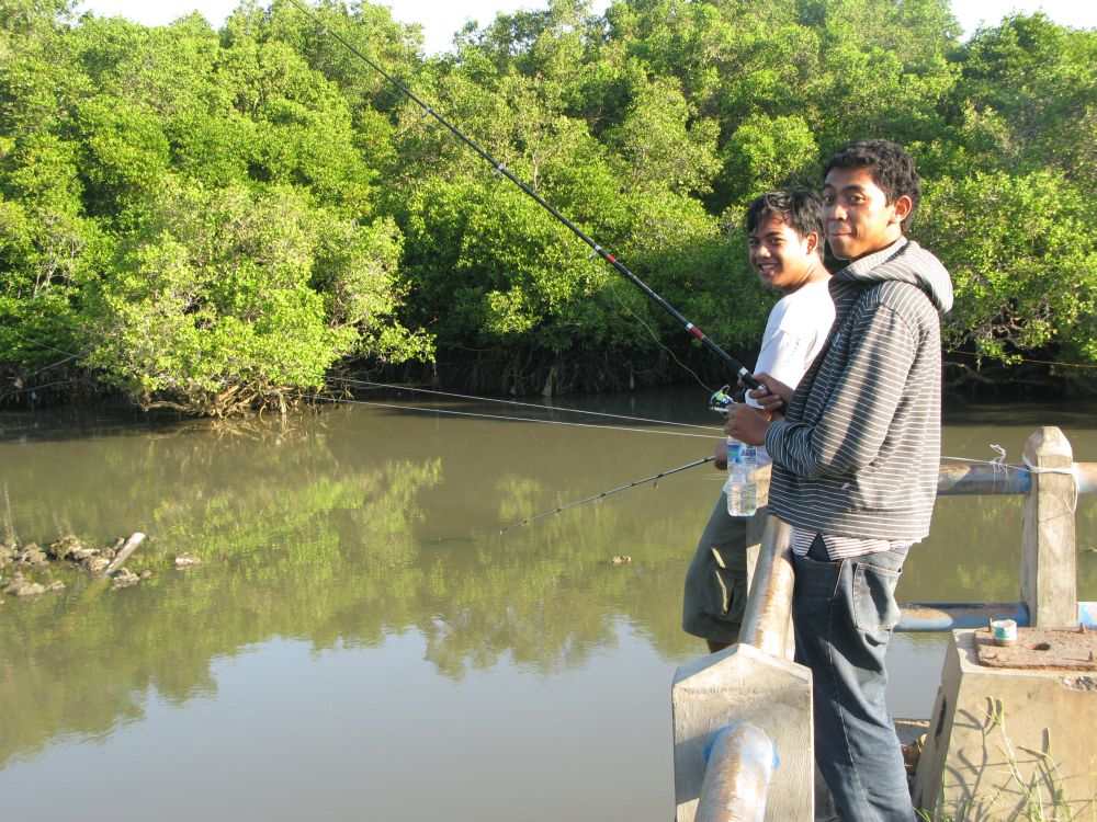 Die findet man an der Küste wie Ketut auch in Richtung Inland. Etwa an der Wehranlage vor dem Rückstaubecken Denpsar, hinter dem der Fluss, der dort in den Ozean mündet, durch die Stadt fließt. Das Meer aber sieht man länsgt nicht von dort. Endlose Mangrovenwälder ziehen sich von dort bis zur Küste entlang. Die Topstelle auch für Pala und Rugin. Sie angeln dort am liebsten mit – ganz herkömmlichen Würmern.