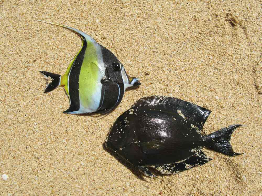 Am Vortag am Strand der Südseite Balis war die Ausbeute besser. Zu gut, andererseits aber auch zu schade. Denn wer fischt schon gern paradiesische Fische aus einem Aquarium heraus? Der Reihe nach: Bei Ebbe gibt das Meer Riffteile frei. Einheimische schlagen mit kleinen Hämmern Teil für Teil ab auf der Suche nach Würmern. Jedem Taucher würde das Mark in den Knochen kochen. Aber mit eben diesen kleinen Würmern lässt sich alles Mögliche fangen: Doppelsattel-Meerbarbe, Masken-Wimpelfisch, Mondsichel-Falterfisch, Indopazifischer Feldwebel, schwarzer Riffbarsch. Am besten, man nimmt sich einen Reiseführer oder Buch über die Fische Südostasiens
