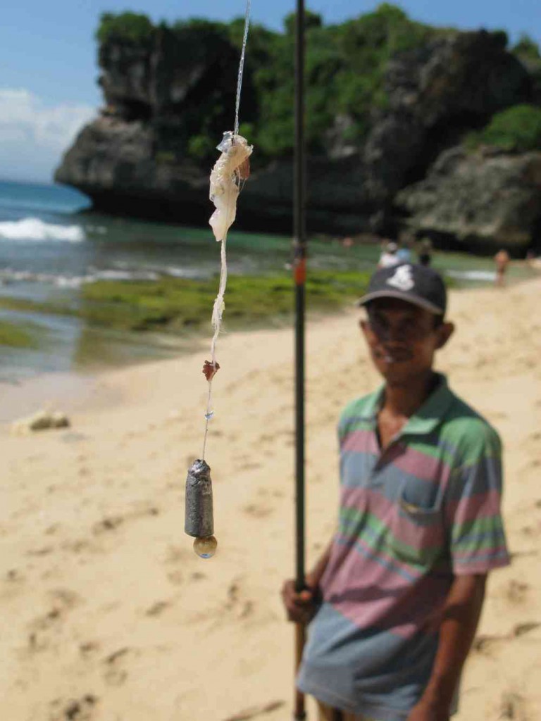 Mit Wayan, einem Korallenknacker, der bestimmt 20 Jahre jünger ist, als er aussieht, wurde der Angeltag am Südende der Halbinsel Kuta am Strand von Uluwatu perfekt. Seine Würmer oder auch Shrimps hängte er an eine Texas-Rig-Montage. Trotz tosender Brandung hatte Wayan damit immer Erfolg.