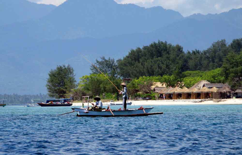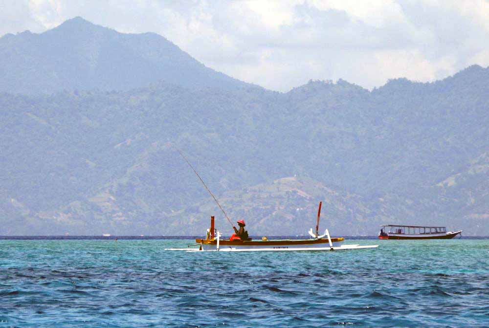 Doch hatte er eine Angelerlaubnis? Fehlanzeige. Von Genehmigungspflicht konnte mir keiner was berichten. Noch irrer: Ein Surfer aus Norwegen, der den Strand entlangkam, sah den Wimpelfisch und flippte völllig aus. Er arbeitet in Oslo in einer Zoohandlung und sagte, dass ein einziger davon bei ihm im Laden 400 Euro kostet. Ähnlich flippte Angar aus, als Ketut und ich wieder Lovina Beach erreichten. Wegen dieser einen Makrele. Dabei hatte der noch mehr auf dem Kasten: Barracudas, Makrelen ohnehin, Thunfische, und zwar gefangen mit nichts weiter als einer dicken, auf einen Holzstab gewickelten Sehne. Ketut nickte, als ich ungläubig guckte. So ungläubig, wie einige Tage zuvor, als zwischen den Inseln von Gili-Islands vor Lombok Meeresschildkröten unter dem Shuttle-Boot hinwegflogen.