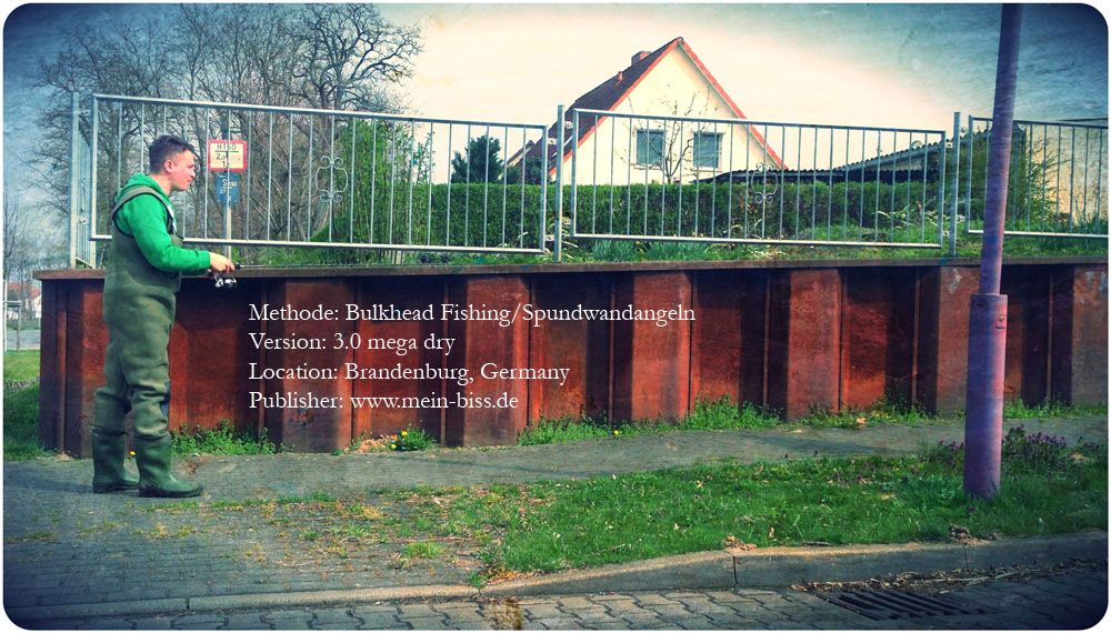 Beim Auswerfen beachtet: Immer möglichst im spitzen Winkel zur Spundwand die Schnur einzuholen! Sonst gibt’s Hänger mit Eurem Gummi. Und welcher Mann mag einen Hänger mit seinem Gummi? Also: Tight Lines auf Barsche und Zander und anderen Trockenfisch! In diesem Sinne immer an der Spundwand entlang angeln.